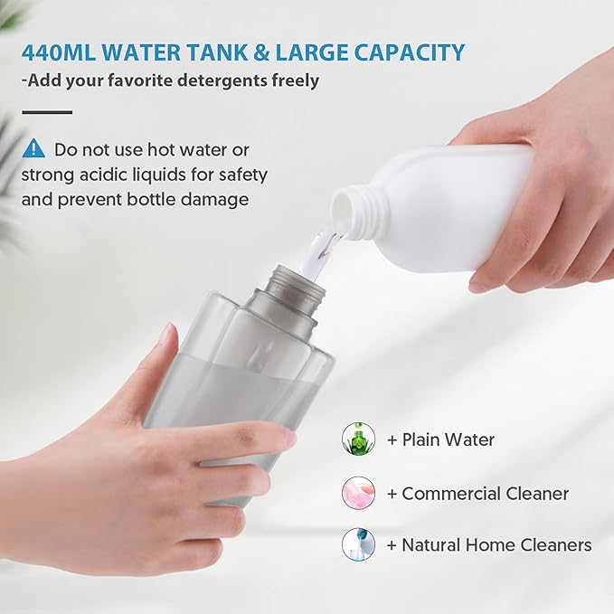 - Refillable and Replace easily Bottle:Easy to sweep all of your rooms with 440 ML bottle, you do not fill the cleaning solution multiple times during the cleaning process. Just fill bottle with water or your favorite cleaning solution and press the convenient trigger on the handle to shine your hardwood, wood, vinyl, ceramic, concrete, tile, laminate wood, floors and etc.Hold the middle of the bottle and gently pull out the bottle to clean after using.(Not recommended for strong acidic liquids)