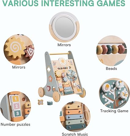- Develop Baby'S Skills: The wooden push walker with 6-in-1 Montessori boards is excellent for enhancing learning and fine motor skills, promoting color recognition, concentration, hand-eye coordination, and fostering imagination development.